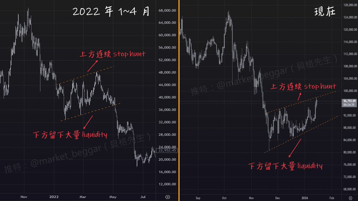 作者 @market_beggar 的交易系統是以流動性(Liquidity)為核心,以線型結構來看,當前走勢確實與 2022 年 1 ~ 4 月有相似之處:價格傾向向上獵取流動性,卻在下方留下大量未被清理的低點隱患。這意味著短期內若能按照作者先前的看法,回測前低(約 80,500 美元)進行一次 Stop Hunt,消除下方引力,對多頭的長期發展將會更健康。