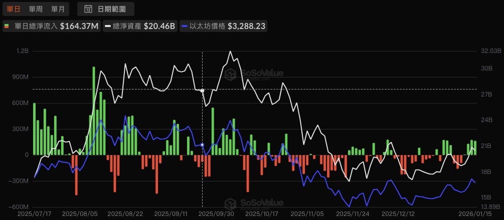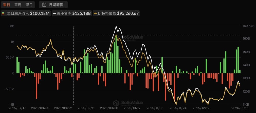 本週 BTC ETF 出現突破性淨流入,於 1 月 13 日幣價反彈的同時,BTC ETF 出現去年 10 月 10 日崩盤以來最大單日淨流入,1 月 13 日與 1 月 14 日淨流入共 15.97 億美元,後續端看淨流入趨勢能否延續下去。