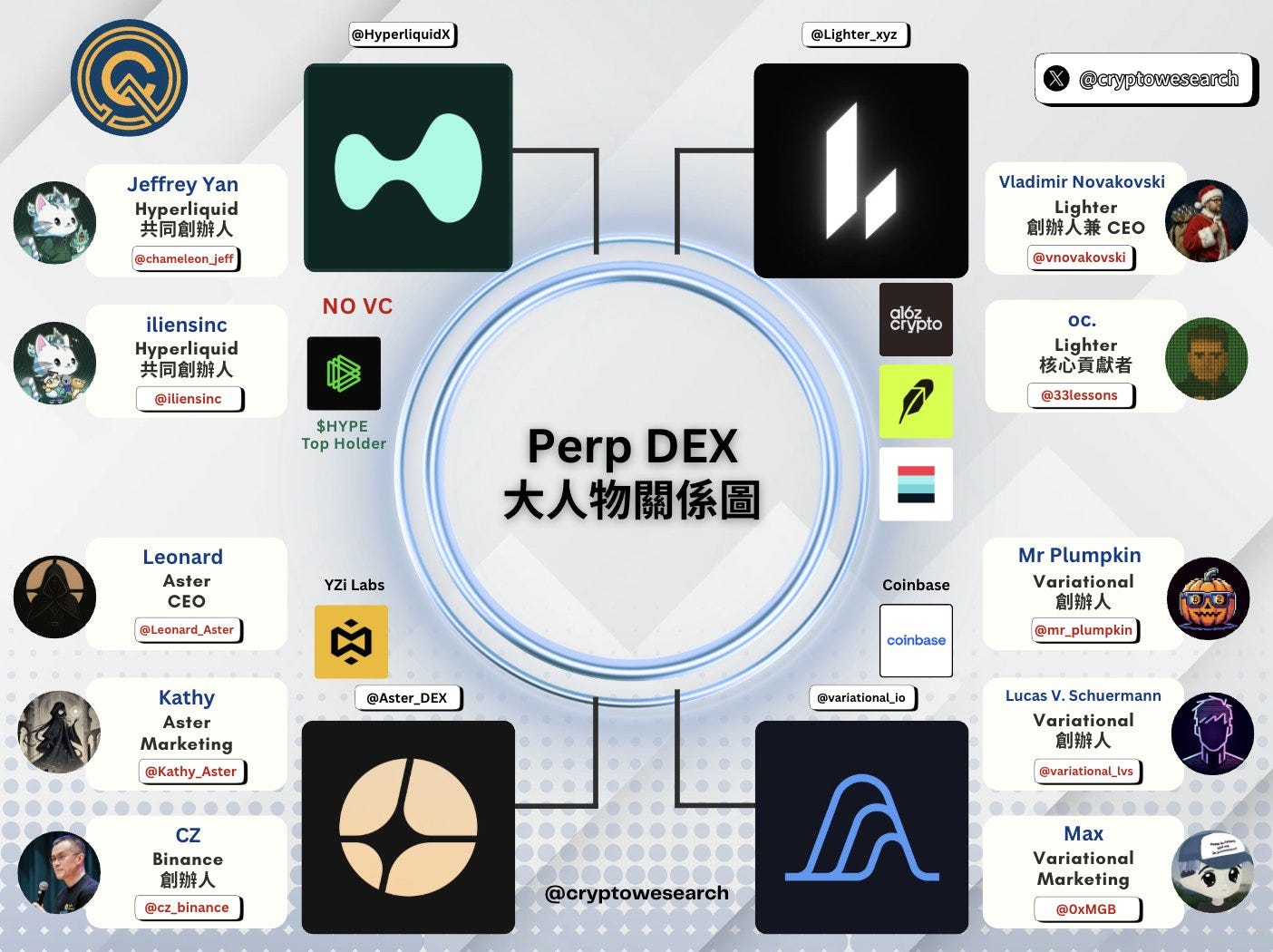 幣研整理了四個備受矚目的 Perp DEX 的大人物關係圖,包括龍頭 Hyperliquid、由 YZi Labs 投資的 Aster、先前剛完成 TGE 的 Lighter 以及有 Coinbase 當靠山的 Variational。