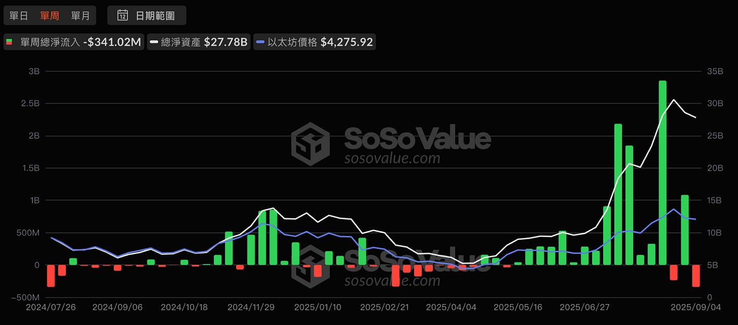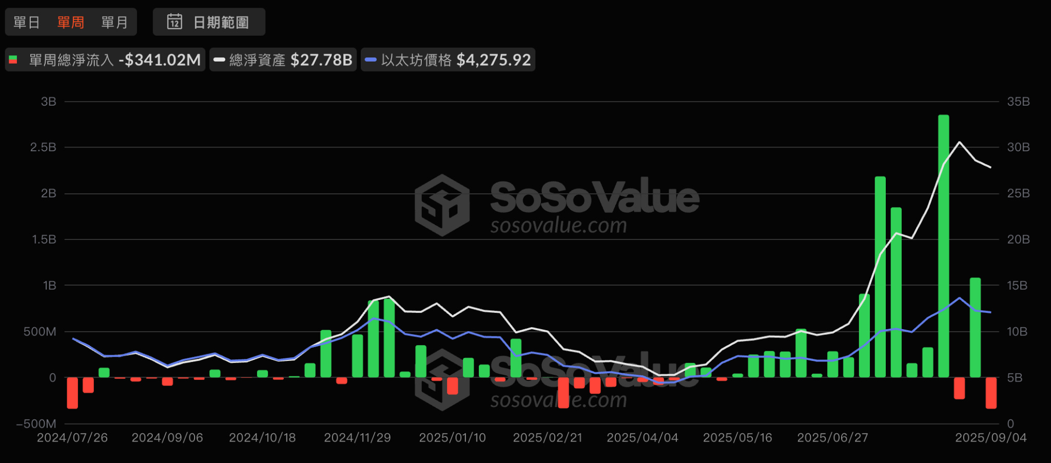 本週現貨 ETH ETF 資金流出,超過 3.4 億美元,光是 9 月 4 日一天就有高達 1.66 億美元的資金流出,持續流出的現象也引起市場對機構投資的情緒還有 ETH 市場未來趨勢的擔憂。