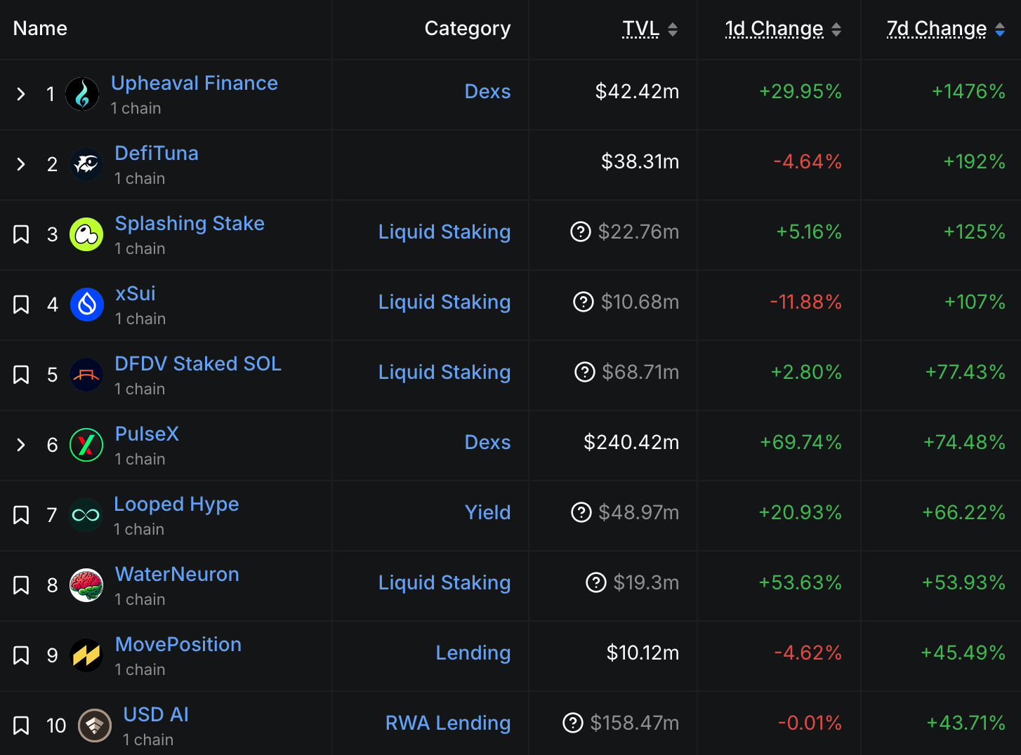 Upheaval Finance(4,242 萬美元,1476%)Upheaval 是 HyperliquidEVM 上的 DeFi 平台,具有超高效的 AMM DEX,TVL 在一週內成長了近 15 倍,主要是因為官方公布了代幣經濟學,吸引了超過 3,500 萬的資金流入。