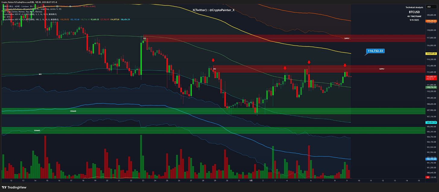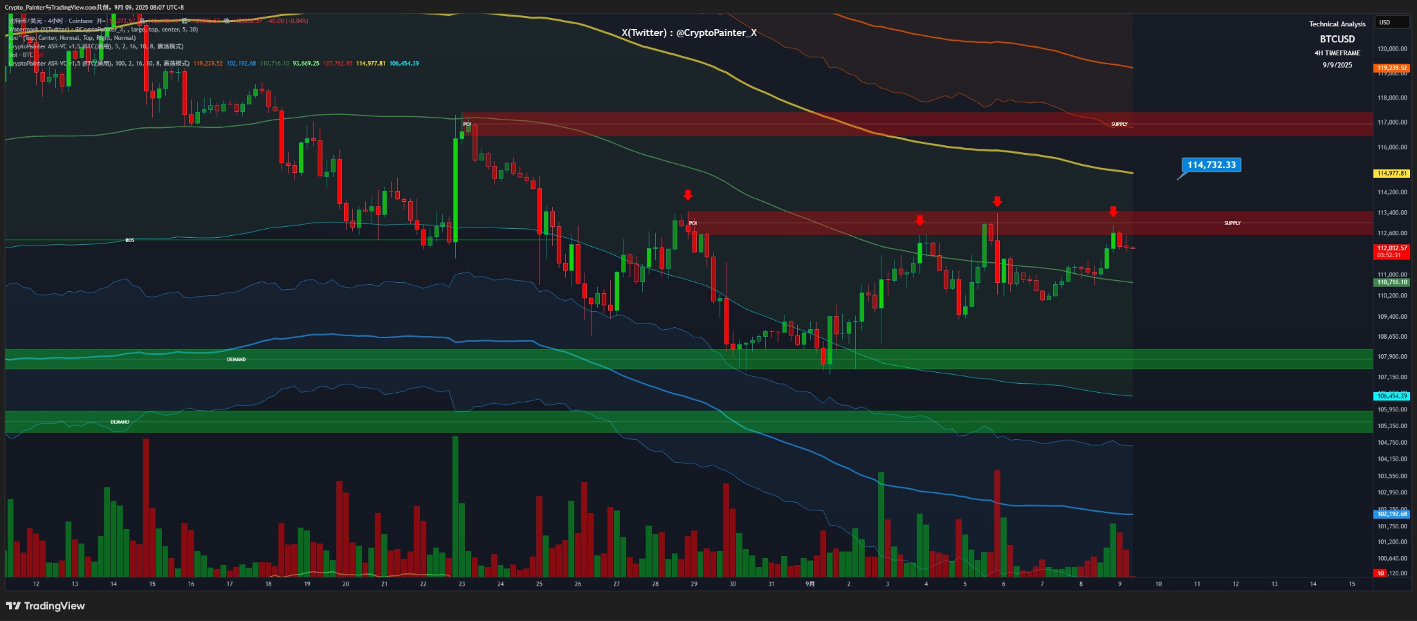 週二晚間的關鍵在於能否成功突破這一多次測試的供應區。如果突破成功,技術面上將形成小級別區間突破,價格有望徹底站上通道中軌,短期目標指向通道上沿的黃線位置,即 114.7k 附近。