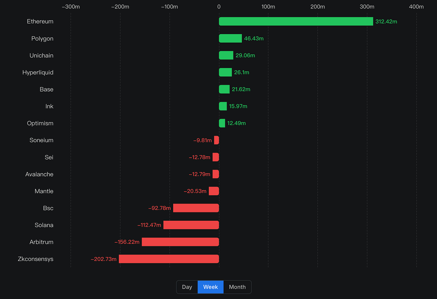本週 Ethereum 的 TVL 流入主要來自 Maple Finance、Ethena 和 Sky,近期市場上熱度極高的 Plasma 與 Maple Finance 合作推出的 syrupUSDT 存款活動,更是帶來了高達 2 億美元的資金流入,其餘像是 Lido 和 Aave 等龍頭協議大多呈現流出的狀態。