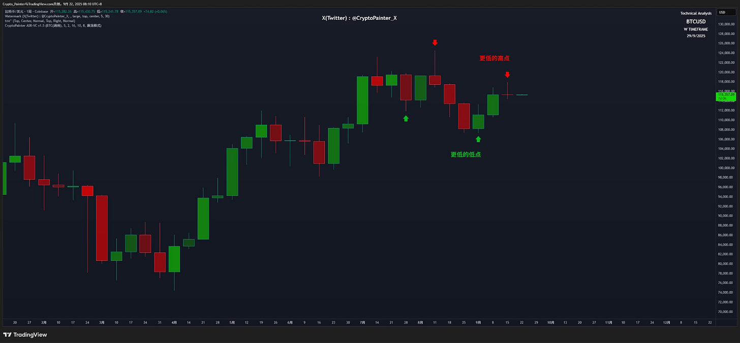 今日份 @CryptoPainter_X 專欄,BTC 週線確認收線,走成了帶有長上影線的小陰線,從價格行為上確認了此處可能會是周線級別反彈的高位;但從 4h 級別來看,小級別行情仍未出現更低的低點,很接近但並沒有確認,因此如果本週行情再次選擇反彈,在周線級別再走出一根長上影線也是有可能的。