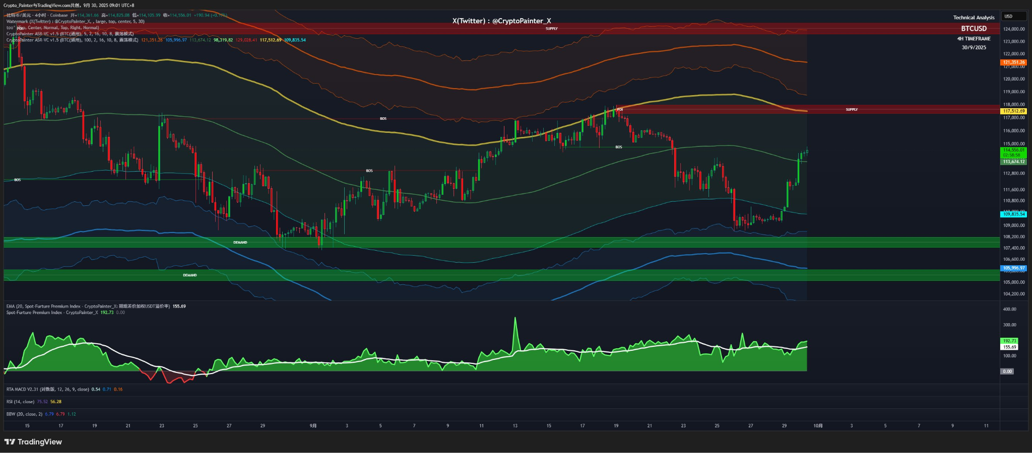 今日份 @CryptoPainter_X 專欄,昨晚反彈讓 BTC 重回中軌,目前在 114k 區間震盪,短期仍可能盤整。若能在 114k 以上站穩兩日,則有望挑戰 117k 的供應區。不過上方存在流動性缺口,空頭需要補充燃料;同時要走出真正多頭,仍需等待通道走平再上行,否則快速觸及上沿多半只是誘多反彈。
