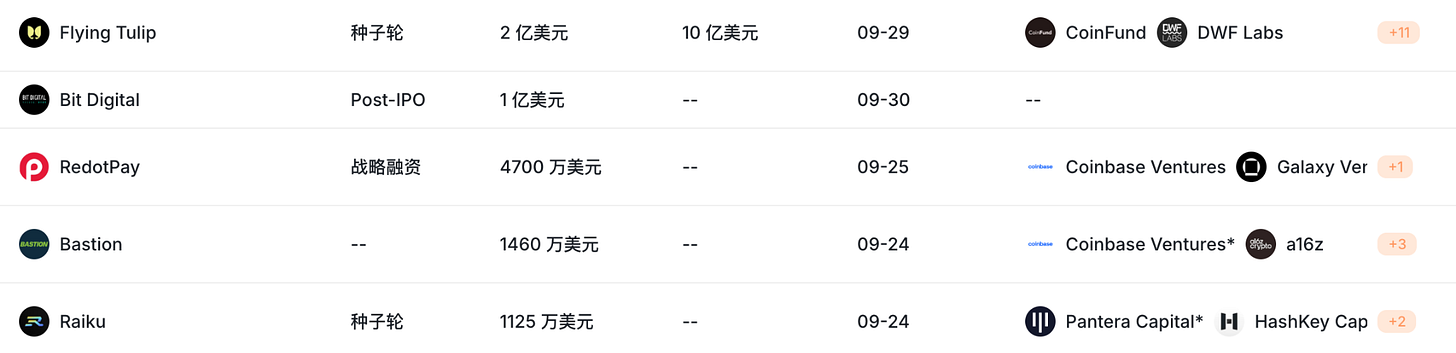 Flying Tulip(2 億美元)Andre Cronje 全新推出的鏈上交易所 Flying Tulip 宣布完成了 2 億美元的私募輪融資,參與的機構包括 DWF、Virtuals Protocol、Brevan Howard Digital、CoinFund 等等。