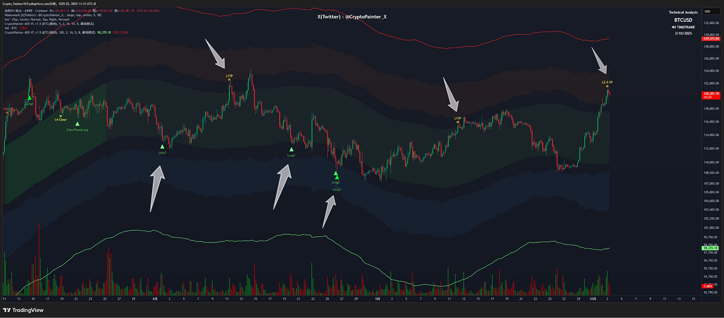 繼續更新 @CryptoPainter_X 專欄。從 ASR-4h 通道在 BTC 上的波段策略表現,可以看出當前市場其實還是處於一個大的震盪格局。只要沒有突破新高,就不能確認多頭趨勢;同樣,在關鍵支撐沒有失守之前,也談不上真正進入熊市。