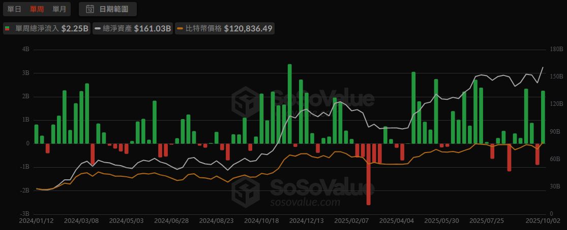 本週比特幣現貨 ETF 終結連續流出,機構回歸市場,總淨資產在 10/2 突破新高達 1,610 億,買盤強勁,一舉扳回上週淨流出總量,富達單日買入 2.99 億美元,貝萊德 $IBIT 進入資產排名前 20 大 ETF,顯示大型機構持續看好。