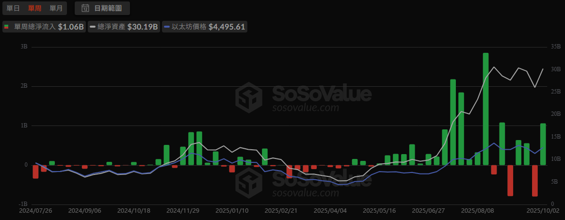 資金流動方面,美國現貨 BTC ETF 在 9/25–9/26 出現大額流出(單日超過 4 億美元),造成價格短線的壓力;不過在 9/30 資金就開始回流,單日淨流入超過 4 億美元,10/1 甚至擴大至 6–7 億美元,近一步推動 BTC 的拉升。同時,ETH ETF 也同樣從 9/25–9/26 的大幅流出,轉為 9/29 單日近 5.5 億美元的淨流入,後續幾日延續資金回補,對 ETH 的反彈形成支撐。