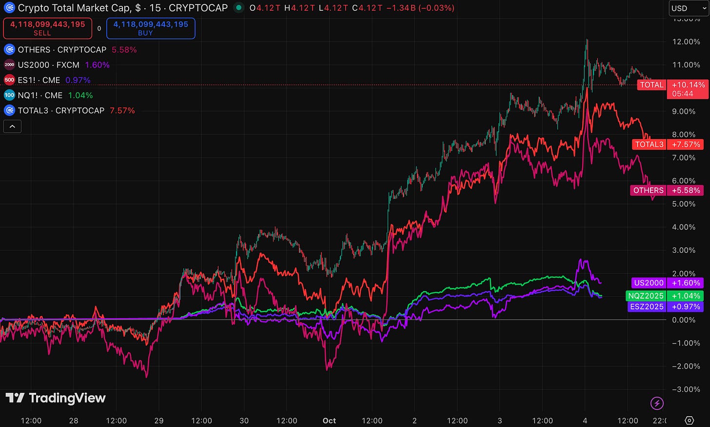 宏觀層面,美國政府停擺、就業數據延遲公布,也讓市場的預期轉向寬鬆。美元指數(DXY)跌破 98,加上美聯儲 9 月已經降息 25 個基點,市場普遍認為 10 月與年底仍可能再降息。數據顯示就業動能放緩但未出現急劇惡化,投資者解讀成「經濟放緩但可控」,因此情緒升溫,資金回補到加密貨幣市場,帶動本週大盤的上漲。