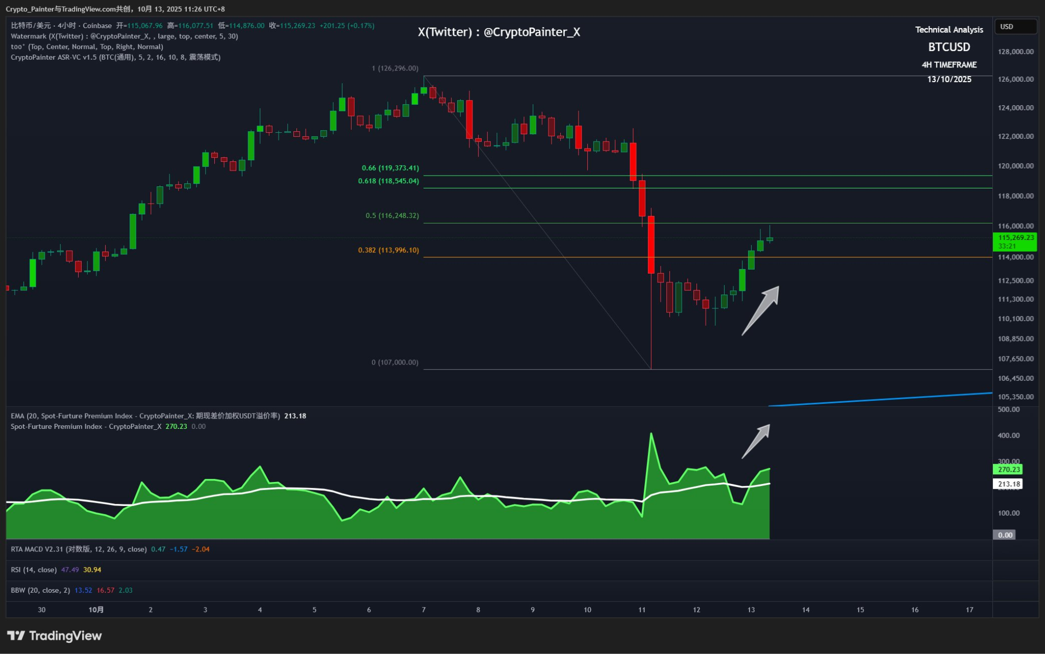 今日份 @CryptoPainter_X 專欄,BTC 在川普 TACO 行為刺激下出現明顯反彈,目前在 4 小時級別的走勢中,價格正好受阻於斐波那契 0.5 回撤位。這波反彈的特點在於現貨溢價與價格同步上升,並未出現明顯的期現背離,顯示盤面結構對多頭相對有利。