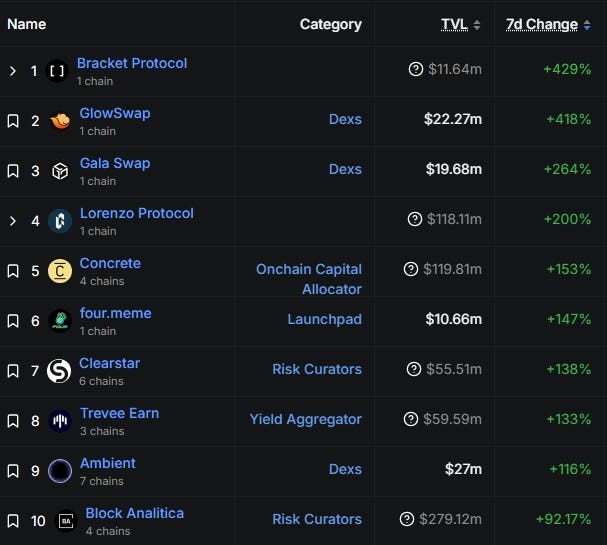 Bracket Protocol(1,164 萬美元,429%)為 Binance Labs 支持的收益金庫平台,近期推出極具吸引力的 bravUSDC Vault 擁有 18.92% APY,促使平台 TVL 成長 429%。