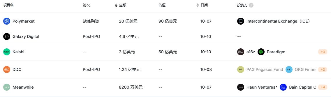 Polymarket (20 億美元)預測市場龍頭於 10 月 7 日宣布完成 20 億美元鉅額戰略融資,估值 90 億美元,投資方為洲際交易所集團(紐約證券交易所母公司 - Intercontinental Exchange,ICE)。