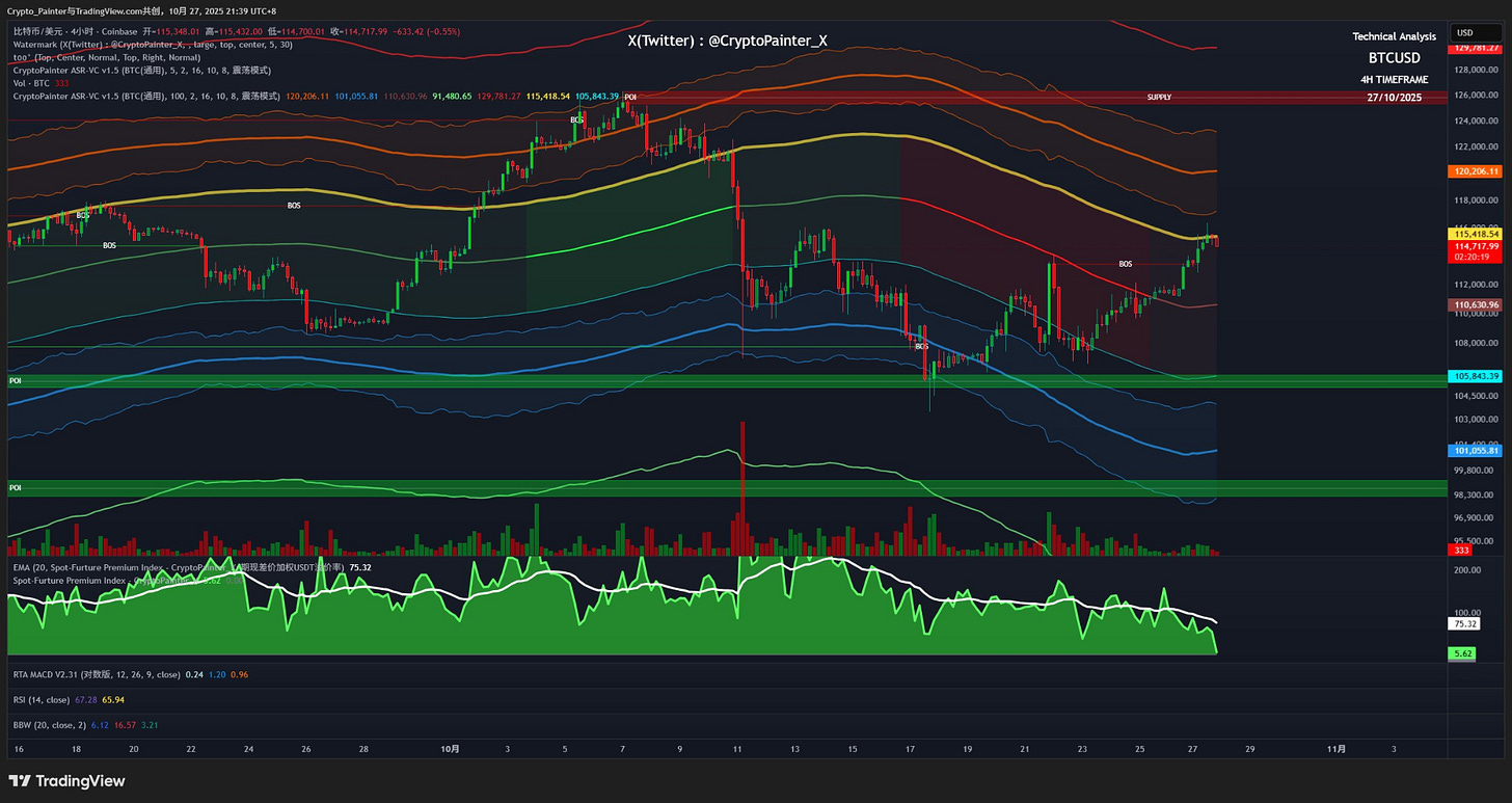 同時,週末至週一期間比特幣反彈時現貨溢價卻持續下降、甚至接近轉負,出現明顯的期現背離,短線偏空、做多風險較高。不過,四小時通道中軌已開始上揚,大結構上多頭動能逐漸增強,若宏觀環境持續利好,後市仍有轉強機會。