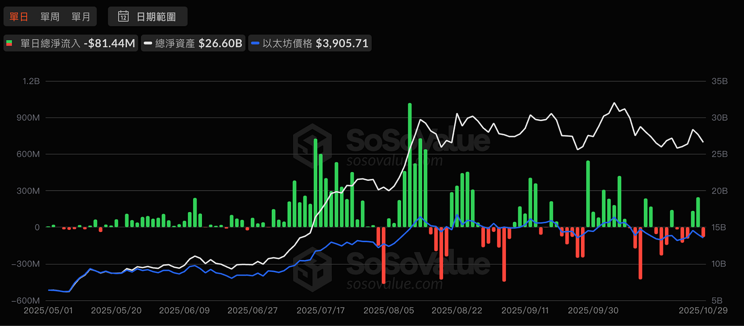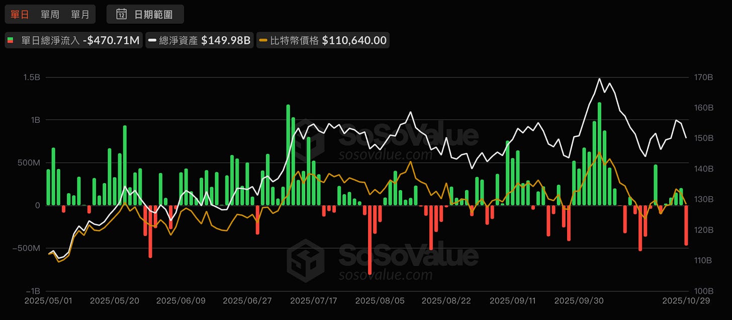 資金流動上,10 月底現貨 ETF 明顯出現資金外流。10/30 比特幣 ETF 單日淨流出約 4.7 億美元,結束連續多日的流入趨勢;以太坊 ETF 也出現 8,000 萬美元級別的淨流出。這反映出機構資金避險傾向上升,雖然月初市場仍延續「 Uptober 」行情的期待,但月底的資金轉冷與價格回檔,整體市場熱度明顯降溫。