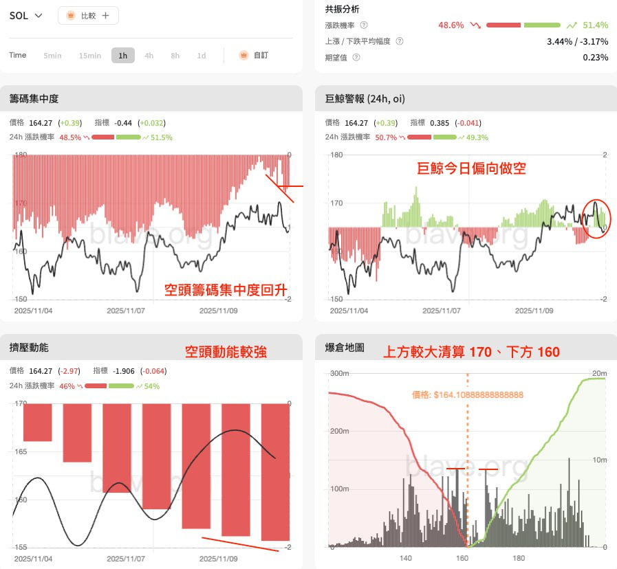SOL - 空頭籌碼集中度回升,巨鯨今日偏向做空,空頭動能較強,爆倉地圖下方 160、上方 170 有較大清算量