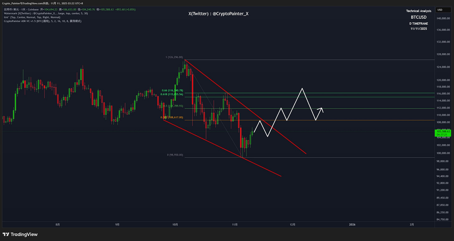 今日份 @CryptoPainter_X 專欄,BTC 自前高回調後,目前走勢已形成一個相對明顯的下降楔形結構。一般而言,下降楔形屬於看漲形態,尤其當價格突破楔形上沿時,往往意味著反轉的開始。從當前結構來看,若價格能順利突破上沿,後續行情有望沿著預期路徑展開反彈,雖然細節未必完全一致,但整體節奏大致相似。