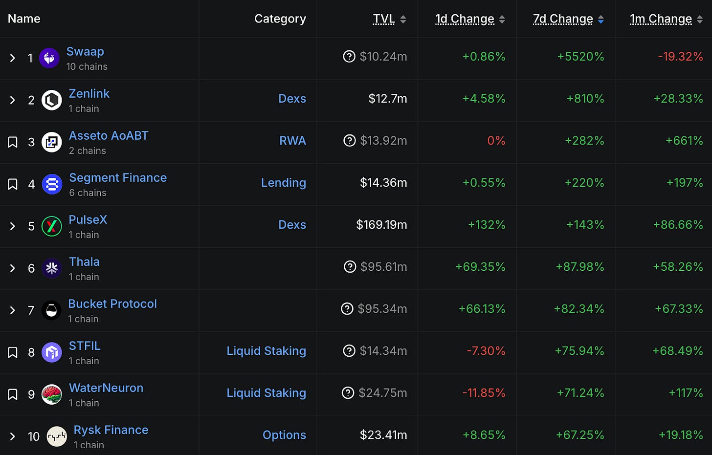 Asseto(1,392 萬美元,282%)Asseto 宣布與 PQA Labs 進行合作,單日帶來了約 1,000 萬美元的資金流入。