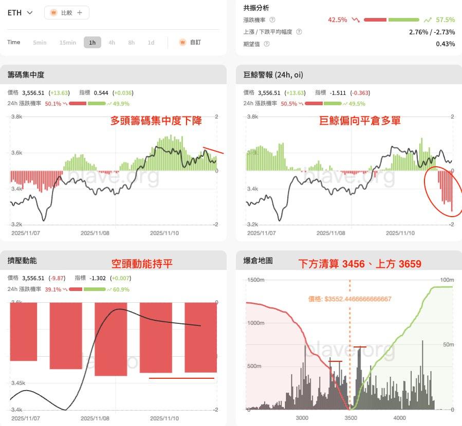 ETH - 多頭籌碼有下降趨勢,巨鯨偏向平倉多單,空頭動能持平,爆倉地圖下方 3456、上方 3659 有較大清算量。