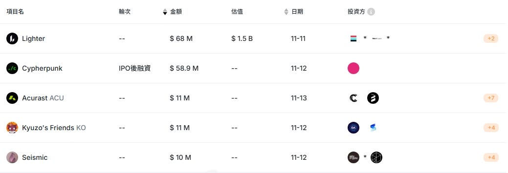 Lighter(6,800 萬美元)Perp DEX Lighter 於 11 月 11 日宣布完成由 Founders Fund 和 Ribbit Capital 領投的 6,800 萬美元融資,其他投資者包括 Haun Ventures 以及 Robinhood。