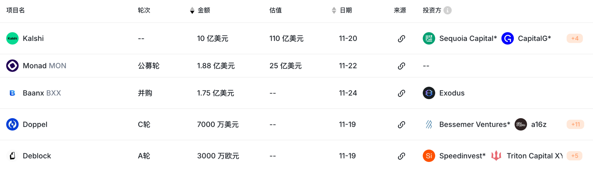 Kalshi(10 億美元)以 110 億美元估值完成 10 億美元融資,Sequoia 領投。其主要競爭對手 Polymarket 近期亦傳擬以 120~150 億美元估值融資。