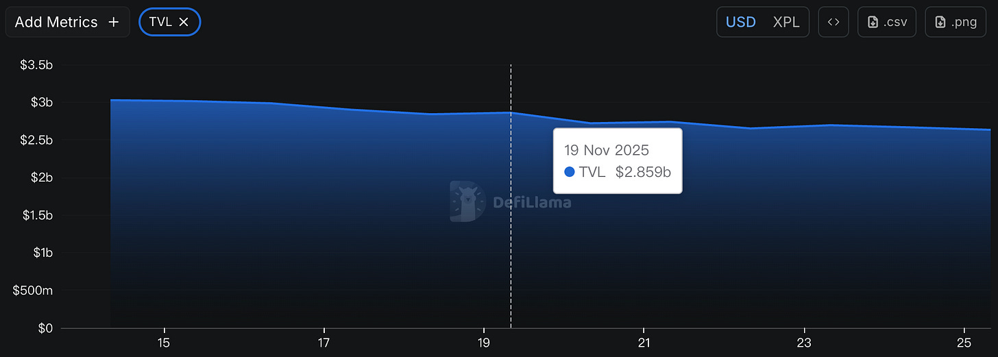 本週 Plasma 淨流入增加,但生態 TVL 並未增長,實際為 2.85 B > 2.63 B