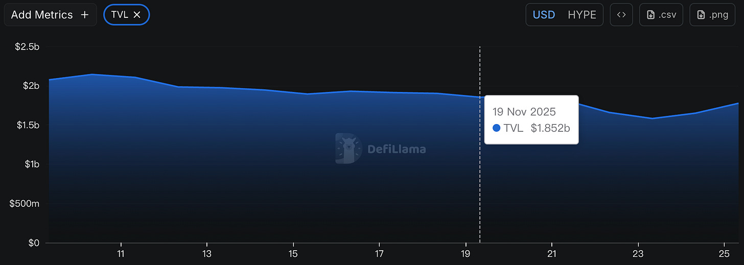本週 Hyperliquid 淨流入增加,但生態 TVL 並未增長,實際為 1.85 B > 1.77 B
