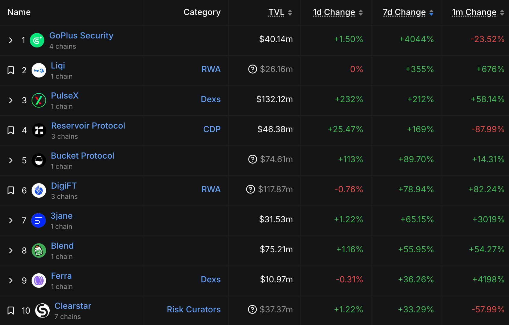 Reservoir Protocol(4,638 萬美元,169%)是一個穩定幣協議,提供包括 rUSD、srUSD 流動性收益資產和 trUSD 期限收益資產等收益,近期與 townsquare 進行整合,接入 Monad 生態,吸引了大量的流動性進入。