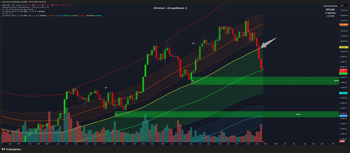 技術面上,周線 ASR 黃線首次被有效跌破,歷史上都是熊市前兆,但通常會先暴力回抽,因此短期仍可能回到 10 萬以上;真正的主跌浪要等市場恐慌全面啟動時才會到來。