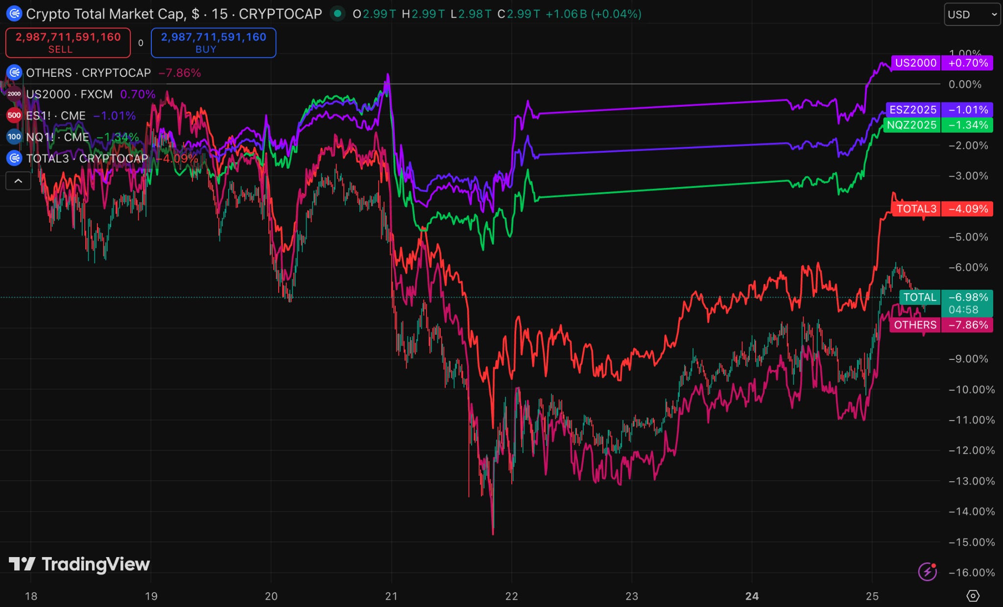 本週加密貨幣市場經歷了顯著的下挫。BTC 從 11 月 18 日約 92,000 美元的高點,受市場避險情緒影響,價格一路下滑,至 11 月 21 日一度觸及約 80,000 美元的低點,隨後在週末微幅反彈至 86,000–88,000 美元區間震盪。ETH 同步走弱,最低跌至 2,600 美元,其餘山寨幣也同步下跌,唯獨 XRP 的表現相對強勢,逆勢抗跌。