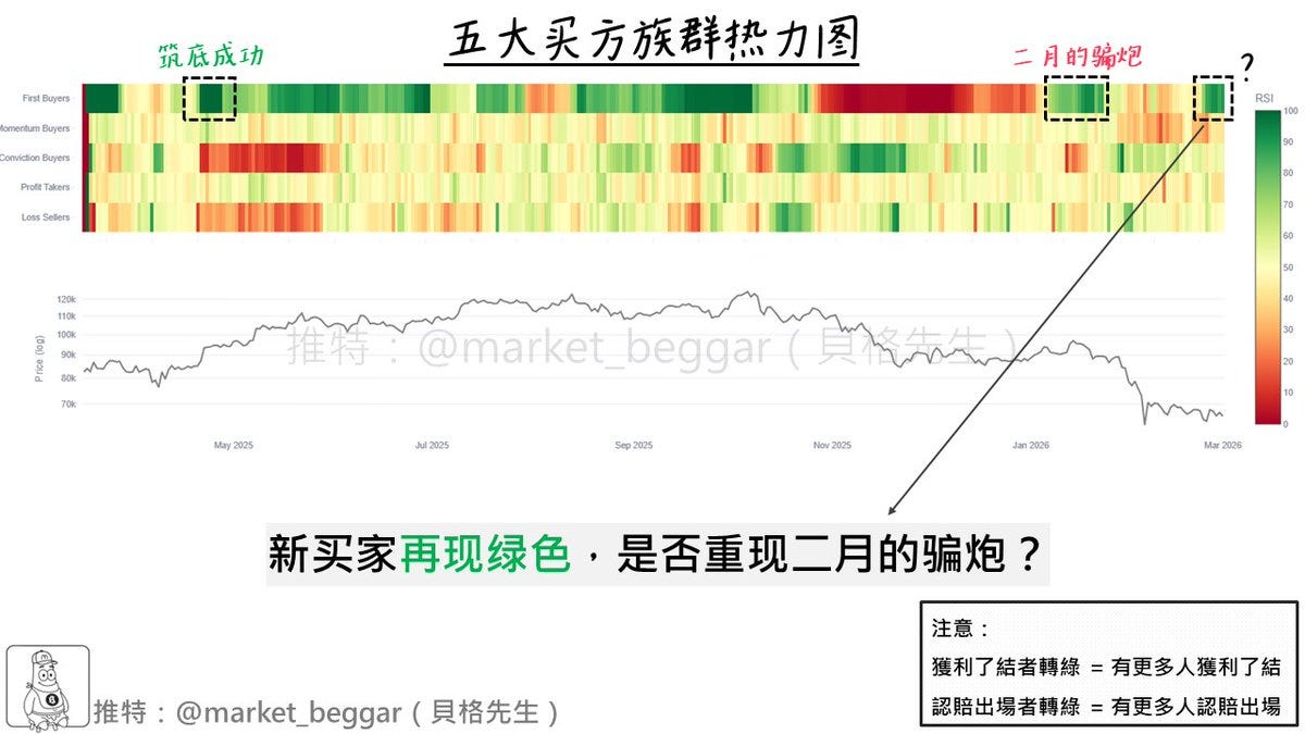 本期 @market_beggar 聚焦在「五大買方族群熱力圖」,作者發現歷經一個多月的震盪以來,首次出現「新買家狀態」增加的情形,也就代表有新買家對 BTC 感興趣。