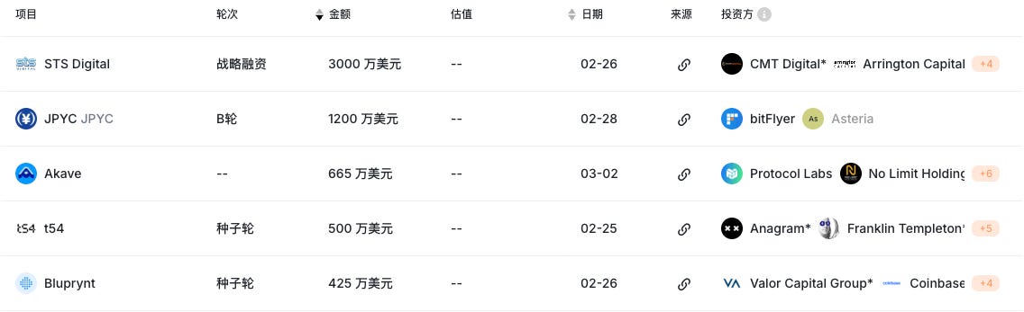 JPYC(1,200 萬美元)日元穩定幣項目 JPYC 於 2 月 28 日宣布完成 1,200 萬美元 B 輪融資,由 bitFlyer 和 Asteria 投資。