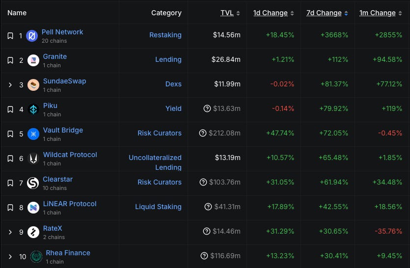 Pell Network(1,456 萬美元,3,688%)未見 TVL 具體增長原因。