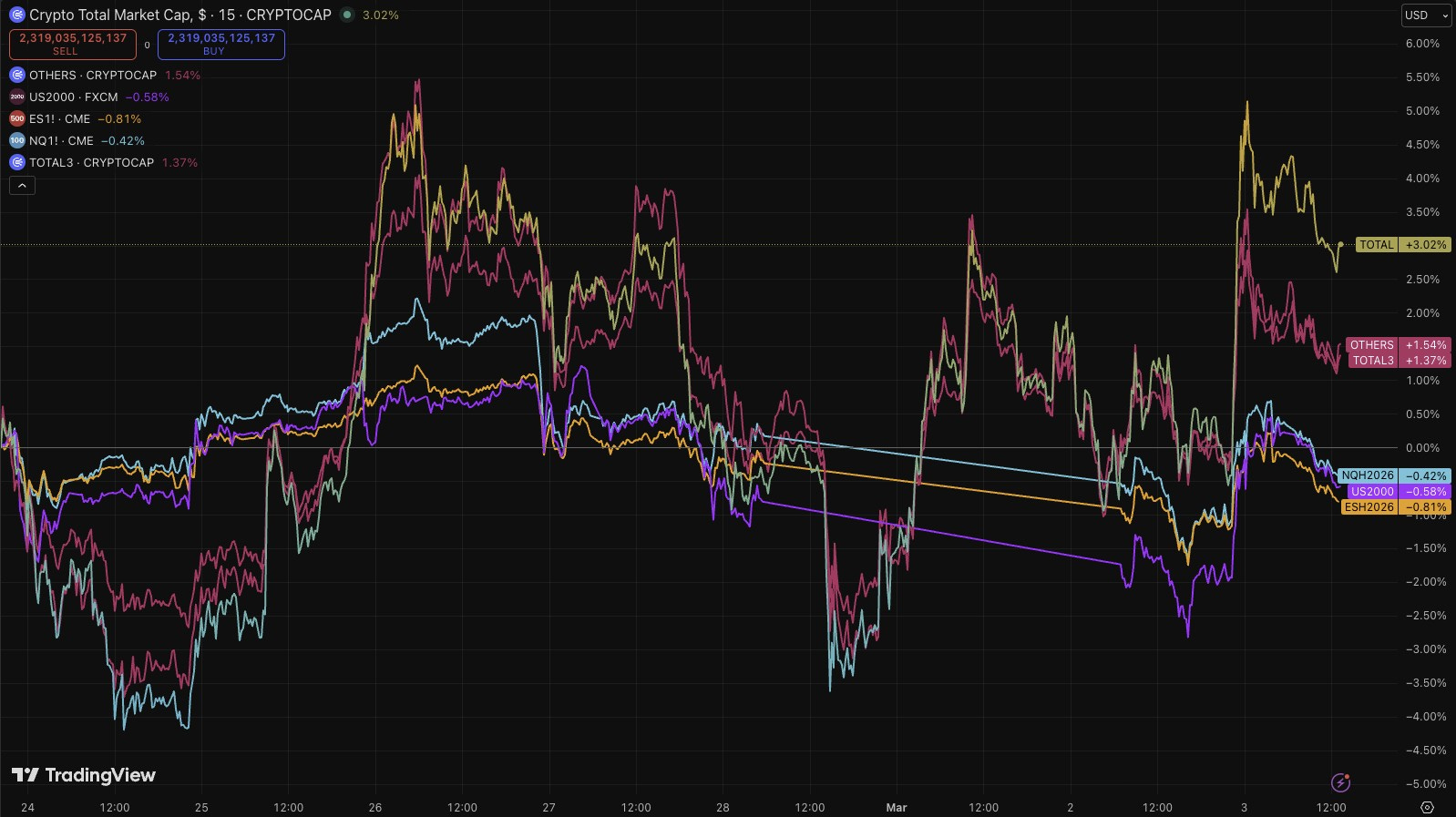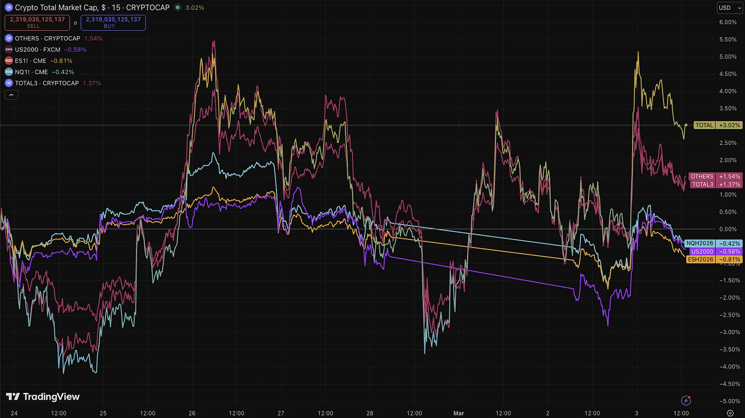 宏觀環境受地緣政治重創,2/28 美國與以色列針對伊朗的軍事行動導致油價飆升,直接迫使比特幣中斷技術性反彈並受戰爭風險重新定價。與此同時,美國正式實施 10% 全球關稅政策,疊加英國央行(BoE)近期的鷹派言論,再次點燃市場對通膨與長期高利率的擔憂。在流動性緊縮與法幣資金成本居高不下的雙重壓力下,風險資產的估值擴張空間遭到嚴格壓縮。