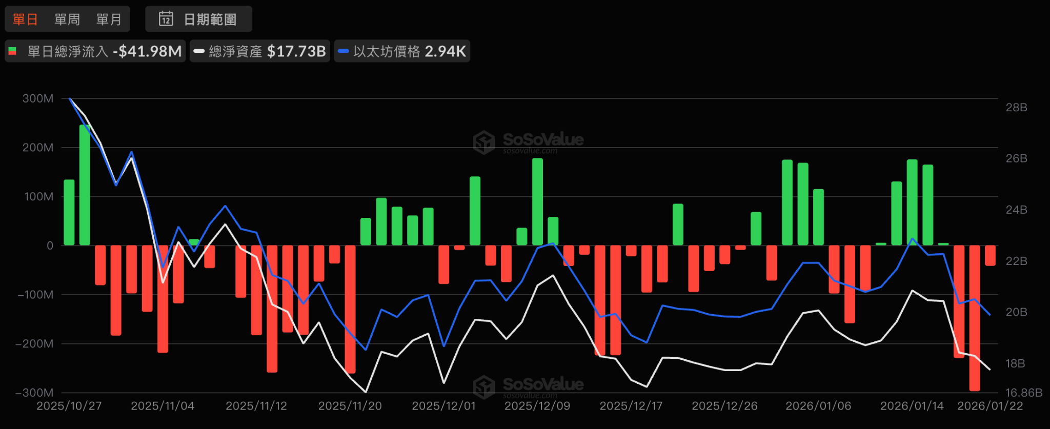 本週 ETH ETF 同樣出現連續的淨流出,整週約 6 億美元,單日高點大多落在 2~3 億美元區間,明顯低於 BTC 的資金撤出規模。資金行為顯示機構對 ETH 偏向短線觀望,中期配置仍保留,但在宏觀不確定性下暫時降低曝險。