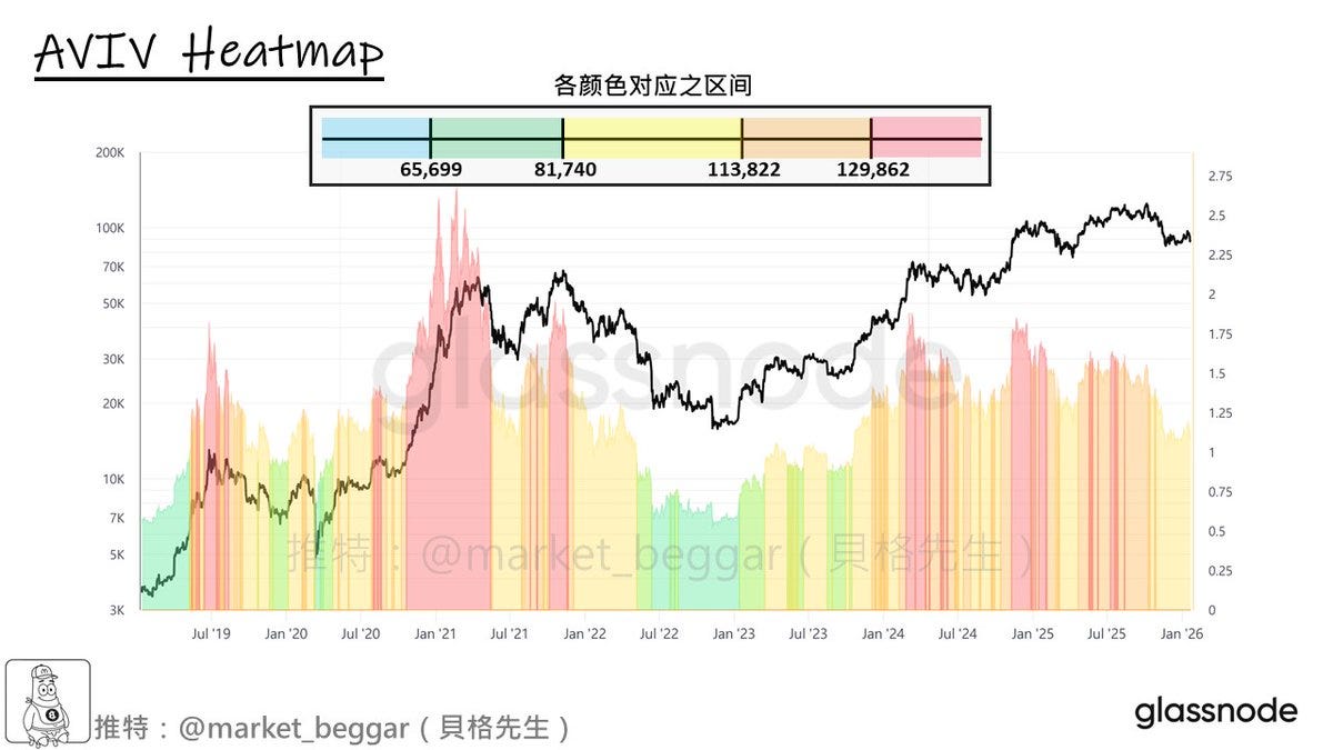 持續更新 @market_beggar,AVIV Heatmap 目前的區域劃分雖隨市場動態微調,但整體支撐結構並未改變。關鍵的「綠色區域」上界目前位於約 81,740 點,這與作者先前提出的 TMMP 模型(81,212)以及偏離度調整的 STH-RP 綠線(81,361)數值一致。這種跨模型、低相關性的數據共振,進一步增強了「淺熊劇本」的可靠性,顯示出若未來發生「前低 Stop Hunt」(流動性掃蕩),該區間將具備極強的支撐潛力。