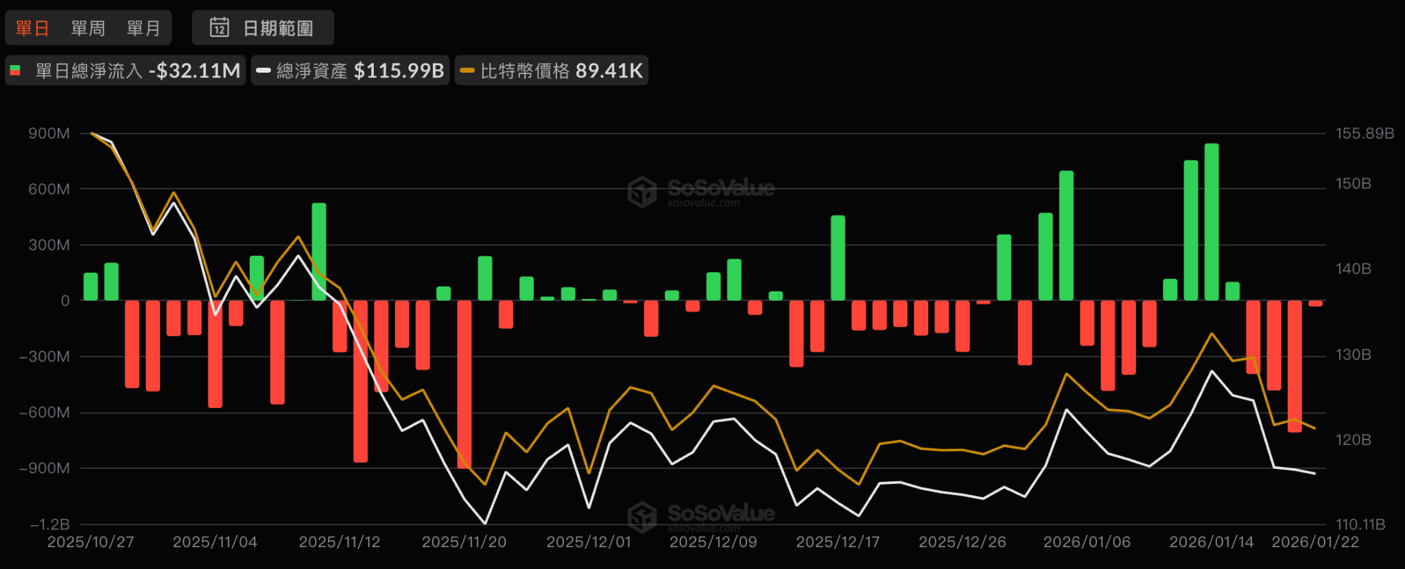 宏觀經濟上,加密走弱與整體風險情緒轉保守高度相關。市場受地緣與貿易不確定性影響,避險資產如黃金白銀走強;同時利率與匯率預期搖擺,美元出現明顯走弱、投資者多聚焦在日本央行政策與全球利率變動,風險資產波動加劇。在「高利率/高不確定性」環境下,槓桿部位的風險更大,連帶 BTC 跌破 90K 後的下跌趨勢。