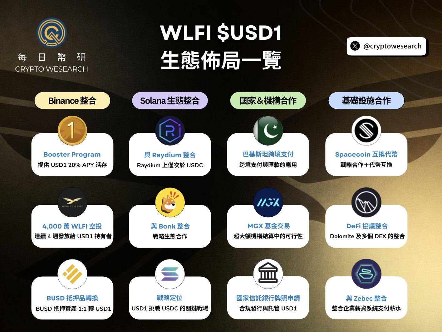 從幣安的 4,000 萬 $WLFI 空投活動,到 Solana 生態、國家級跨境支付、機構級結算等,川普系 WLFI 近期動作頻頻,幣研針對這塊整理了 12 個近期 USD1 的佈局計畫。