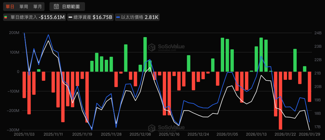 本週 ETH ETF 同樣呈現淨流出趨勢,總計約流出 1.15 億美元,1 月 26 日曾一度出現淨流入 1.16 億美元,隨後便遭市場崩跌影響,總淨資產已經下跌至去年年中的規模。