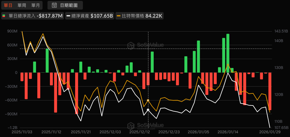 ETF 資金撤退潮加劇,單週淨流出規模擴大至逾 11 億美元,機構拋售意願強烈。延續上週的流出態勢,本週比特幣現貨 ETF 出現更大規模的資金外逃。數據顯示 1 月29 日流出達到高峰(約 8.17 億美元)。在價格持續走弱的環境下,機構投資者正在加速降低風險資產曝險。