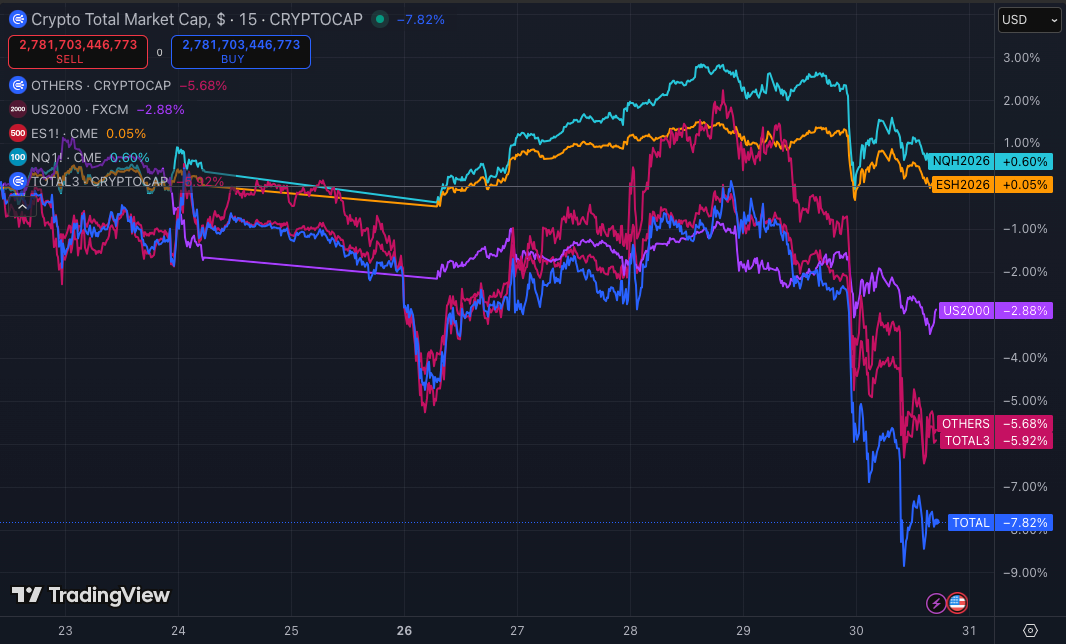 宏觀避險情緒升溫,週初加密貨幣與傳統避險資產走勢「嚴重分歧」。 本週市場受聯準會主席人選及政策不確定性干擾,疊加科技股財報疲軟,導致風險資產全面承壓。資金明顯轉向傳統避險標的,黃金本週突破 5,600 美元、白銀更創下 120 美元歷史新高,與加密貨幣的跌勢形成強烈對比,不過在 1 月 29 日晚間開始貴金屬同樣出現歷史性級別崩跌。市場出現拋售潮,觀望氣氛濃厚,靜待下週政策局勢是否明朗。